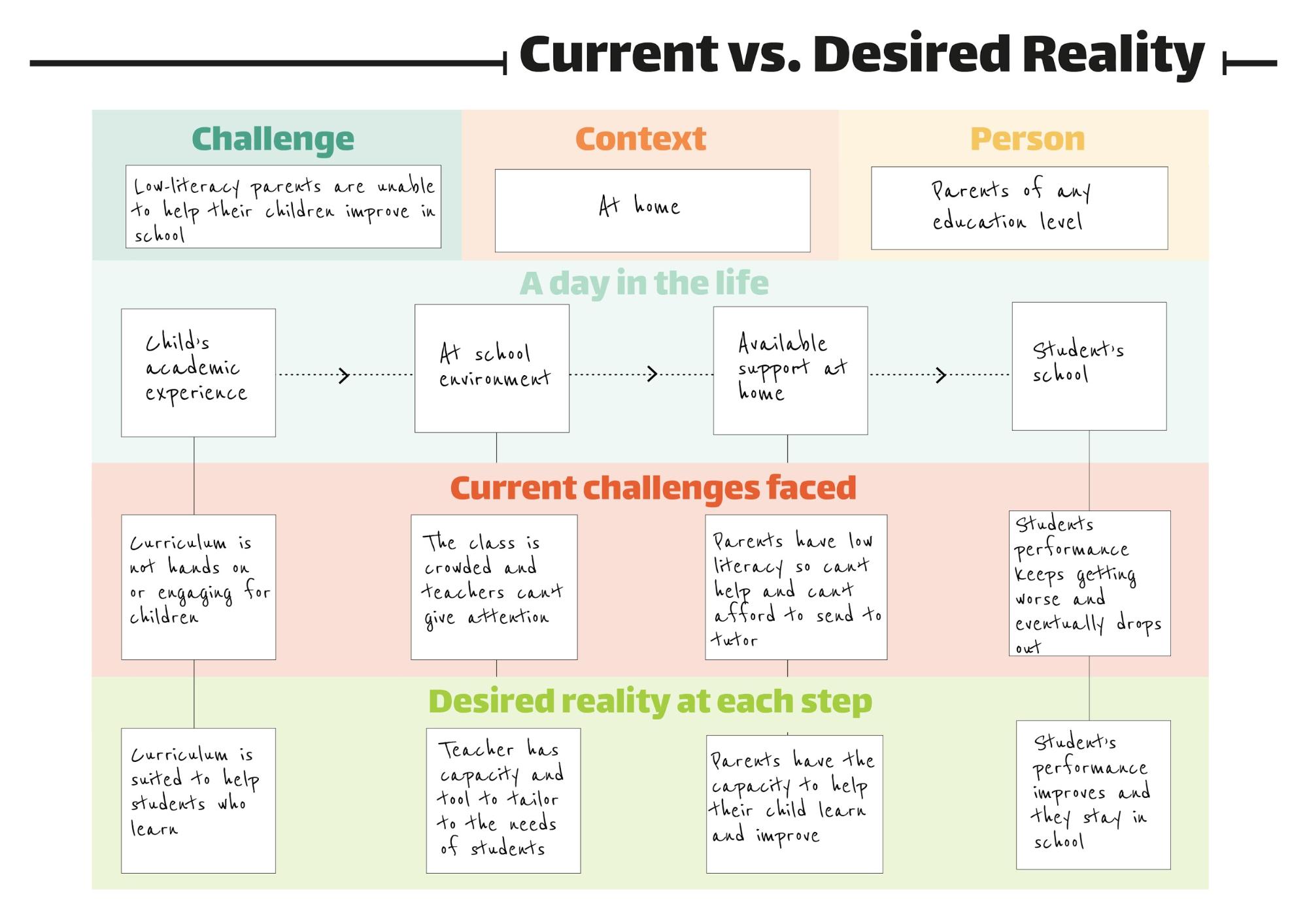 Understanding their current and desired reality, we used to keep asking ourselves questions at every step. Everytime we did this, more questions and solutions emerged that we were not expecting, yet they led us to unique opportunity spaces. For example, we started hearing parents state their desire to spend time with their child after school, to do something together and learn at the same time. At the time, we were focusing on teachers as our intended user, yet hearing that desire from parents made us realize that parents, unlike teachers, had the time and willingness to facilitate our solution.