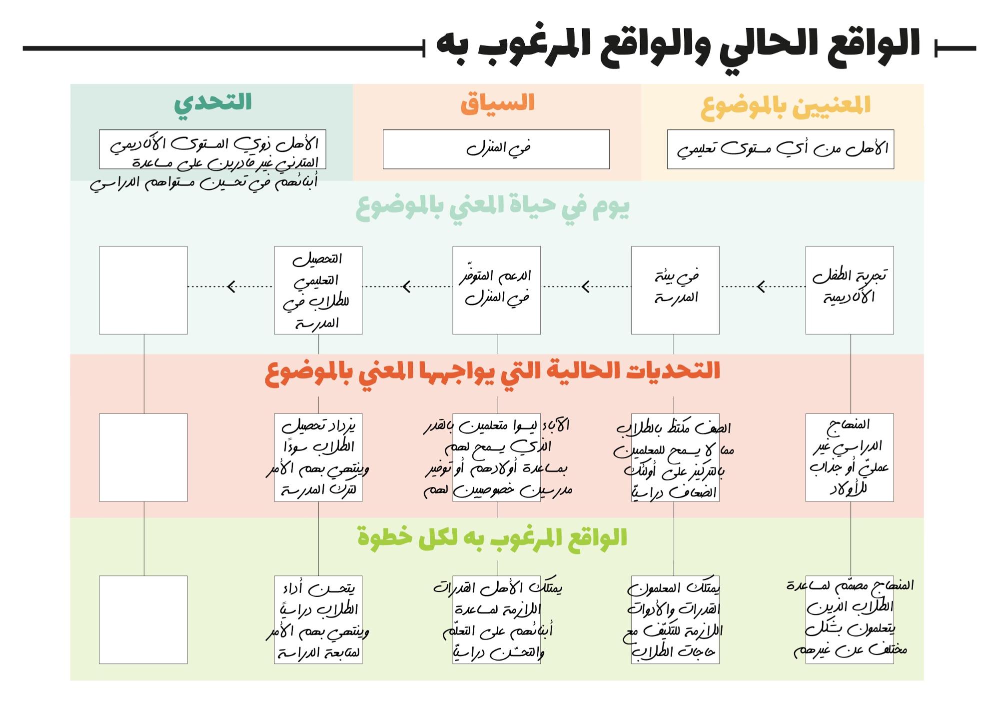 أرادت المجموعة المكونة من عبدالله، وأسماء، ونبراس، ومحمد استكشاف دور الآباء والمدرسين في هذا الموضوع، واختبار من هو المستخدم الفعّال في حل هذه المشكلة. ساعدت هذه الأداة هذه المجموعة في تحديد الرحلة اليومية الحالية التي يخوضها الطلاب ذوو الدخل المحدود، والشكل الذي سيبدو عليه الواقع المرغوب به بالنسبة لهم. في البداية، ركزت المجموعة جهودها في تقديم حل يتمحور حول بناء قدرات المدرسين، ولكن من خلال هذا النشاط، أدرك أفرادها أنّ المعلمين كانوا مثقلين بأعباء العمل. لذا، قاموا بتحويل المستخدم المستهدف إلى الأهل الذين يعانون من ضعف في القراء والكتابة ومهارات الحساب، لتطوير ملحق على منهاج دراسي منخفض الكلفة يمكّنهم من تعليم أولادهم المهارات الرئيسية من خلال أنشطة النمذجة التي باستطاعتهم تطبيقها في المنزل.